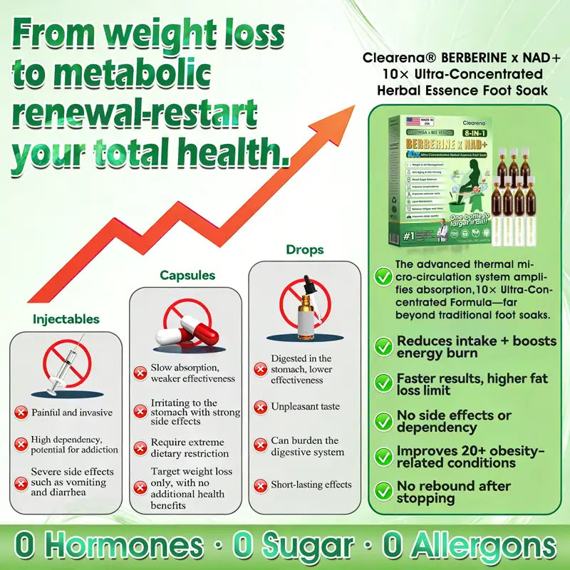After more than 12 years of research, our team began self-testing a new program using warm-water herbal activation through the Clearenaยฎ Moringa ยท Bee Venom ยท Berberine ร NAD+ Eight-in-One 10ร Ultra-Concentrated Herbal Essence Foot Soak, successfully overcoming the limitations of traditional single-pathway interventions that commonly lead to gastrointestinal issues. By adopting a dual-pathway strategyโsupporting appetite regulation and fat metabolism while simultaneously addressing skin firmness during weight lossโwe observed significant improvements in metabolic function and body composition, without rebound weight gain or adverse reactions.