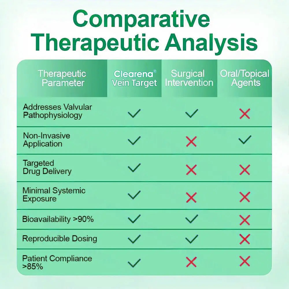 Clearena® VeinTarget represents the first commercially available transdermal phytotherapy system specifically designed to address venous valvular insufficiency through localized botanical intervention. Unlike systemic treatments that dilute active compounds throughout the circulatory system or topical applications that cannot penetrate the dermal barrier. our microneedle delivery system ensures concentrated therapeutic compounds reach the target tissue with minimal systemic exposure.